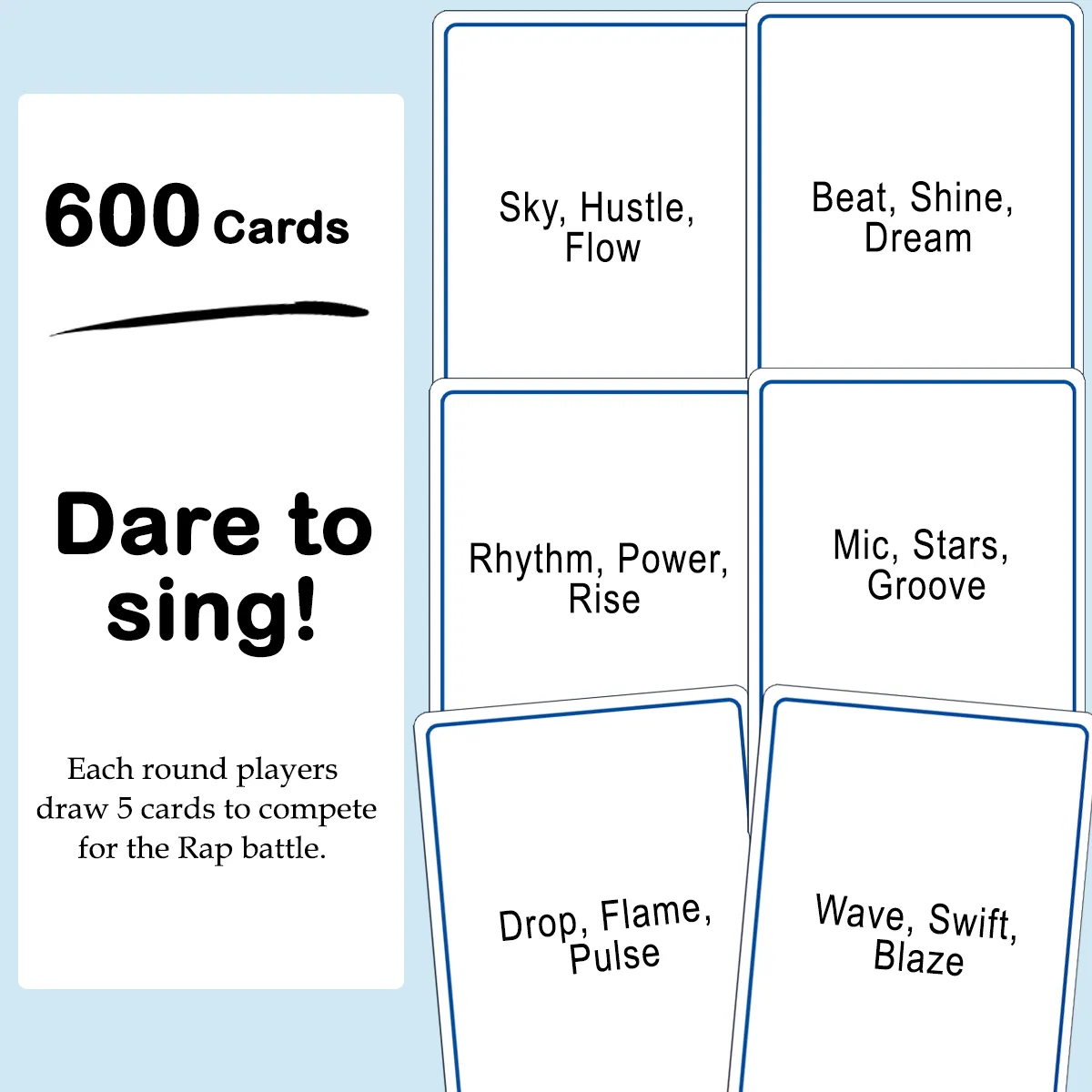 Objective: Create the best rap using all the words on your cards. Impress your friends with your rhyming skills and rhythmic flow!